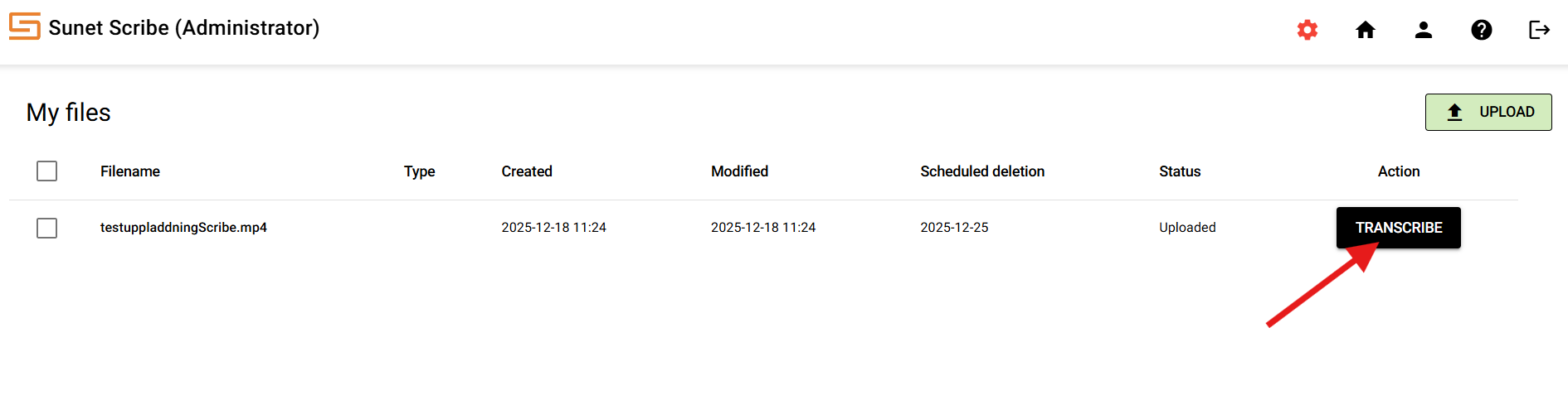 The status of your file will now change first from uploaded to transcribing and then when it is ready to completed. It is important to know that your file will only be saved in Scribe for seven weeks from the time you uploaded it and then it will be deleted automatically. You can see the date when deletion will take place under "Scheduled deletion". When your file is finished transcribing, press "EDIT" to see the result.