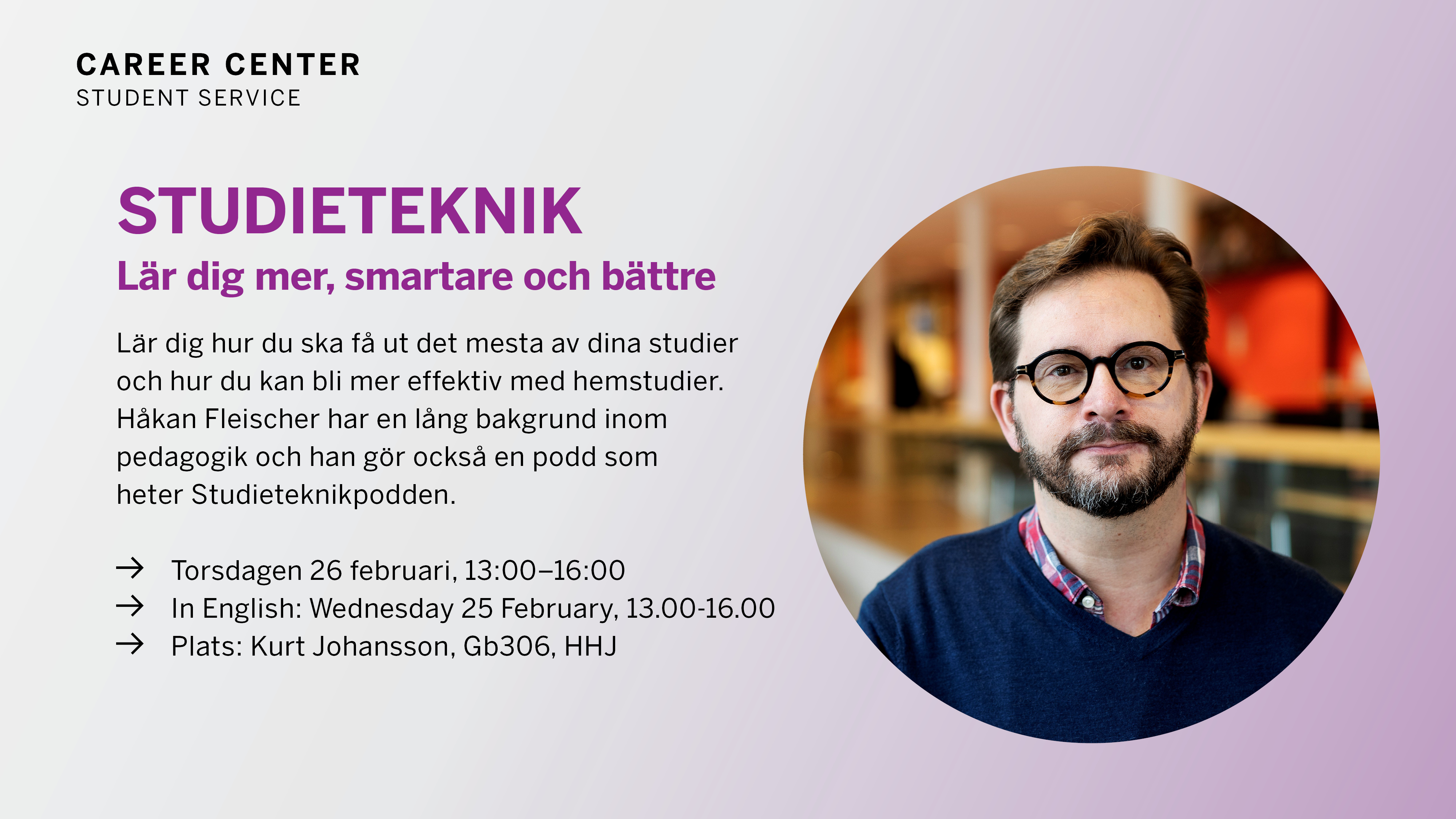 Håkan Fleischer har en lång bakgrund inom pedagogik och han gör också en podd som heter Studieteknikpodden. Under föreläsningen lär han ut olika studietekniker till nya och gamla studenter.